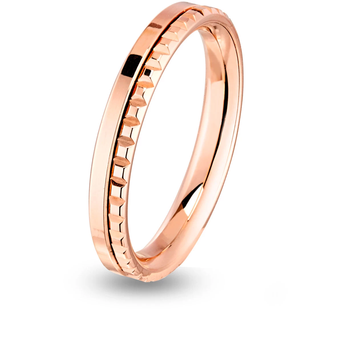 La bague de mariage a une moitié avec des motifs en carré de chocolat, l’autre moitié est sans motifs poli.