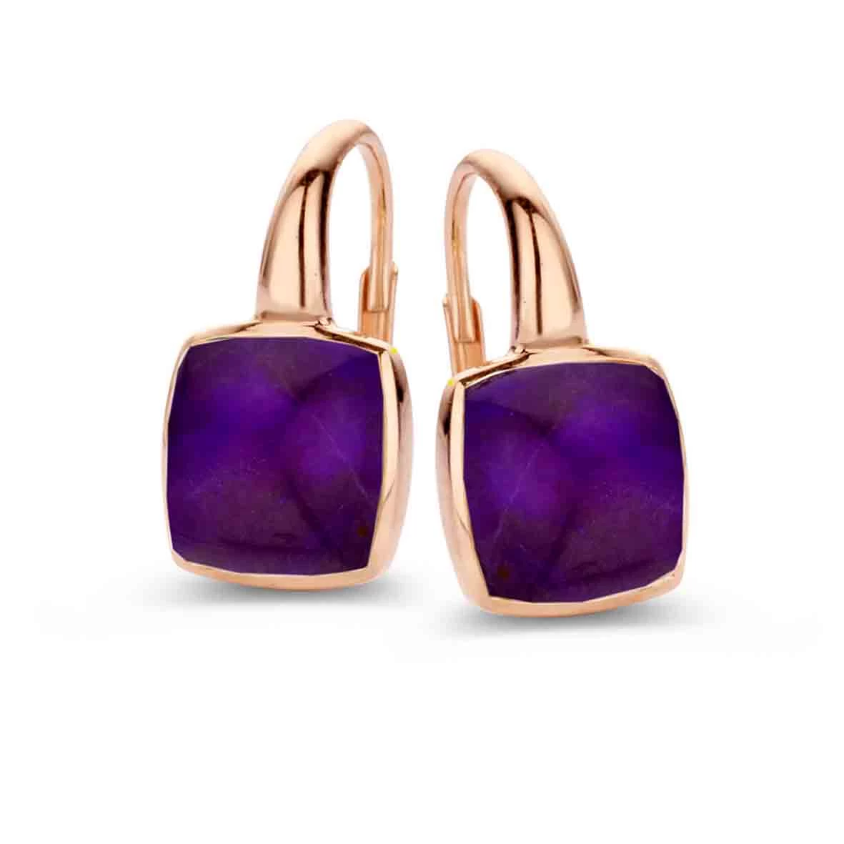 Ce bijou est en or rose à l’aspect poli, avec un quartz et sugilite sertie sur chaque boucle.