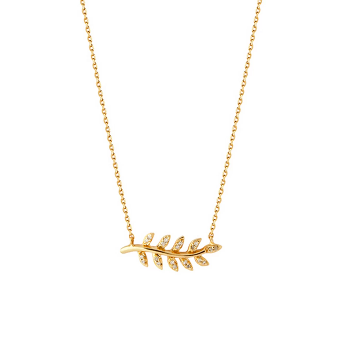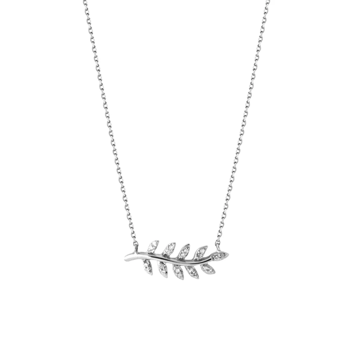 La maille de la chaîne est une maille forçat, une feuille serti de diamants mettra en valeur votre cou.