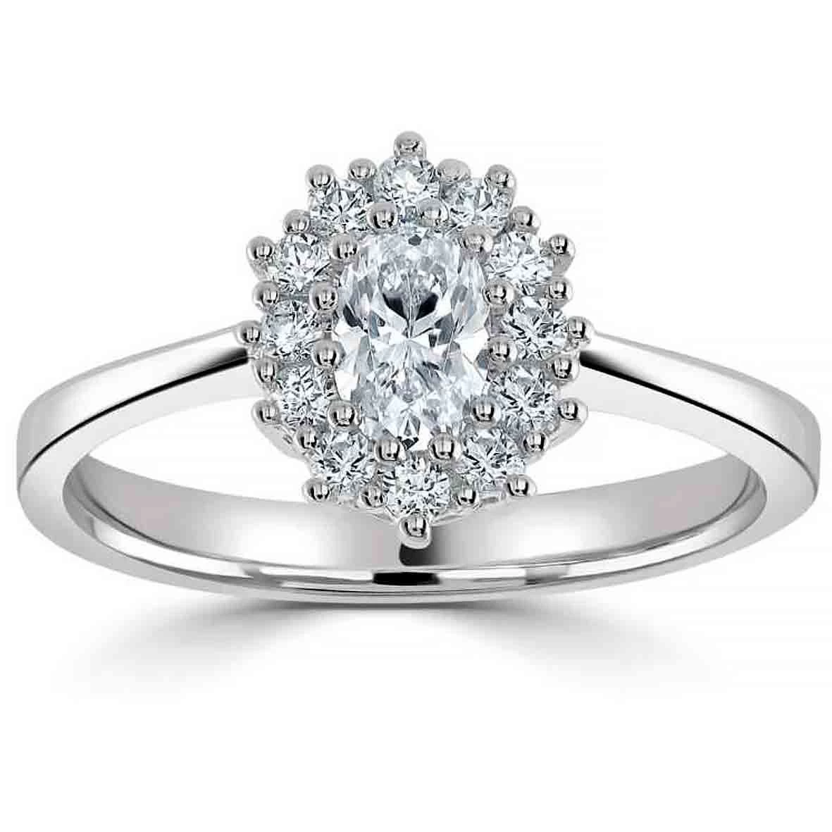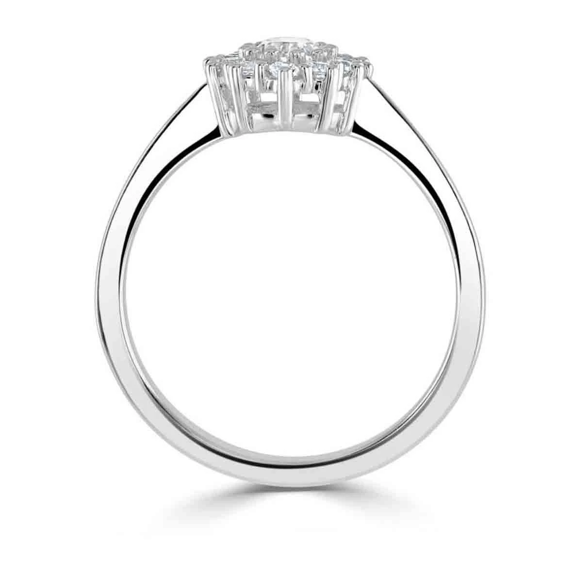 Le diamant de centre serti par des griffes. Un entourage de diamants ronds permet de donner une grande impression de brillance