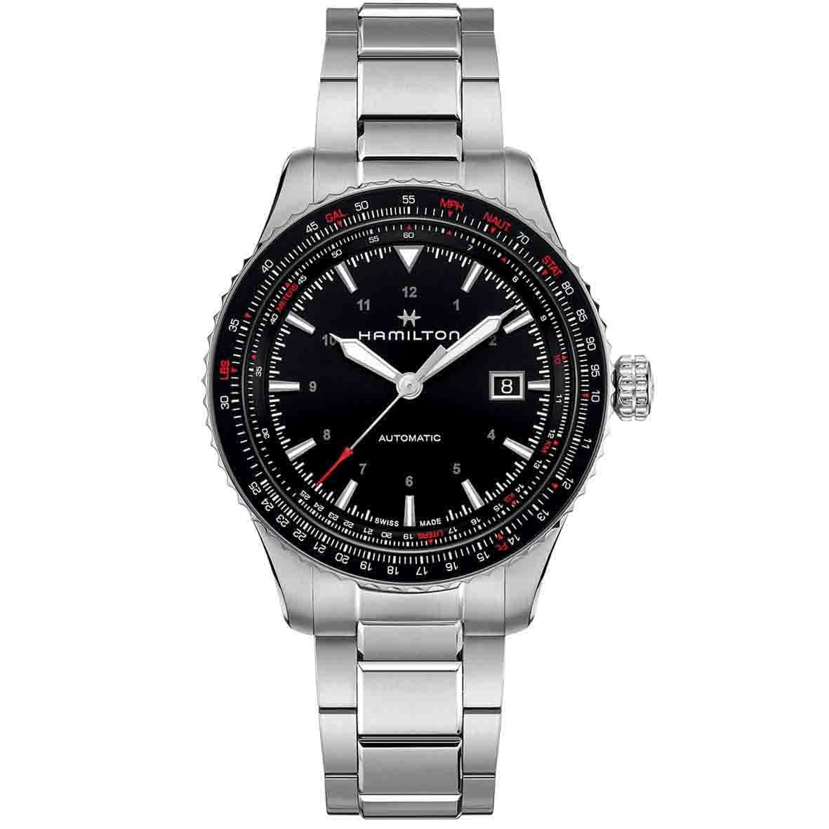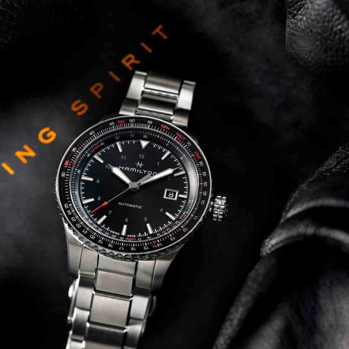 le cadran noir épuré de 42 mm renferme le mouvement à remontage automatique H-10 doté d’une réserve de marche de 80 heures.