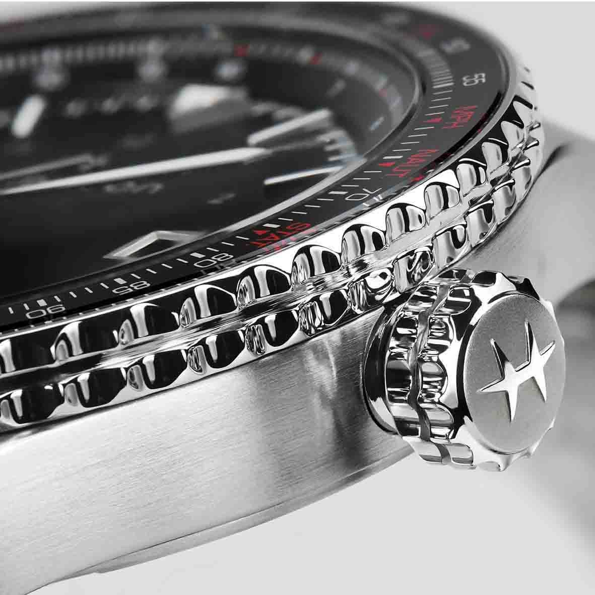 Une lunette règle à calcul tournante bidirectionnelle effectue des opérations et des conversions essentielles, et l’alliage à spirale anti-magnétique le plus avancé jamais inventé, NivachronTM, garantit une précision optimale dans tout type d’environnement.