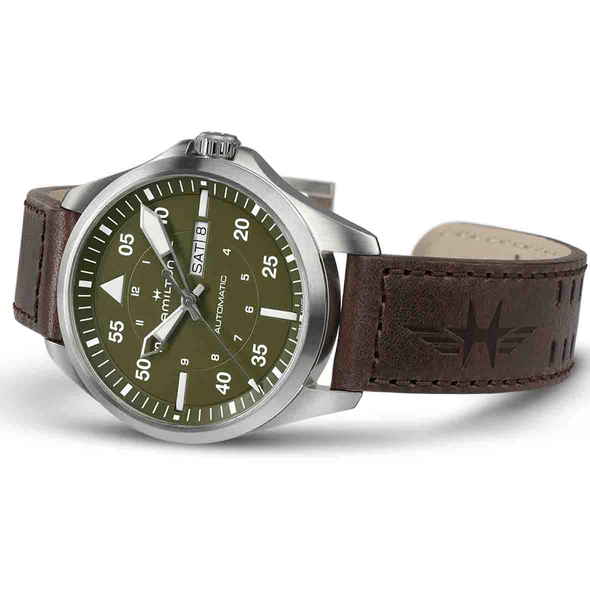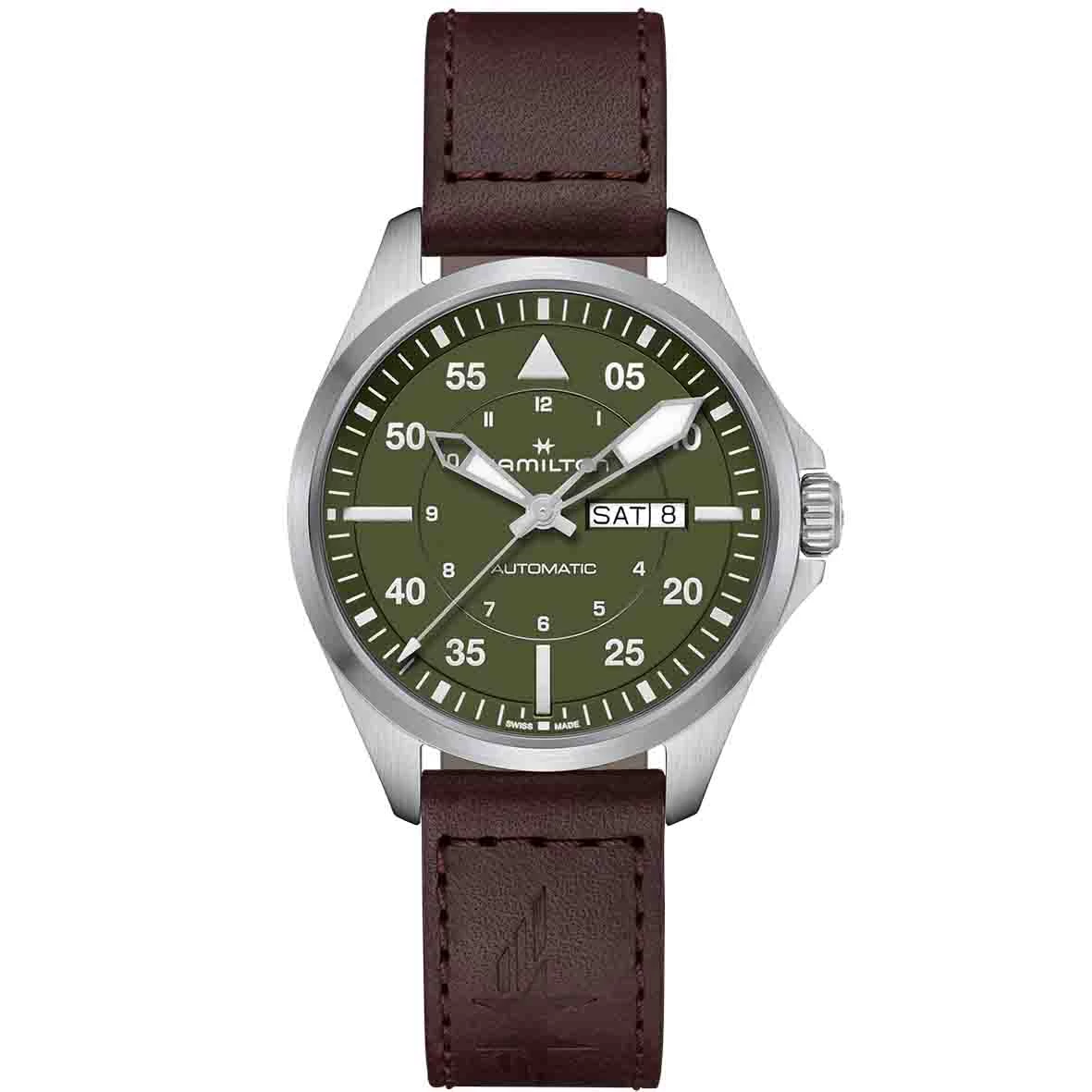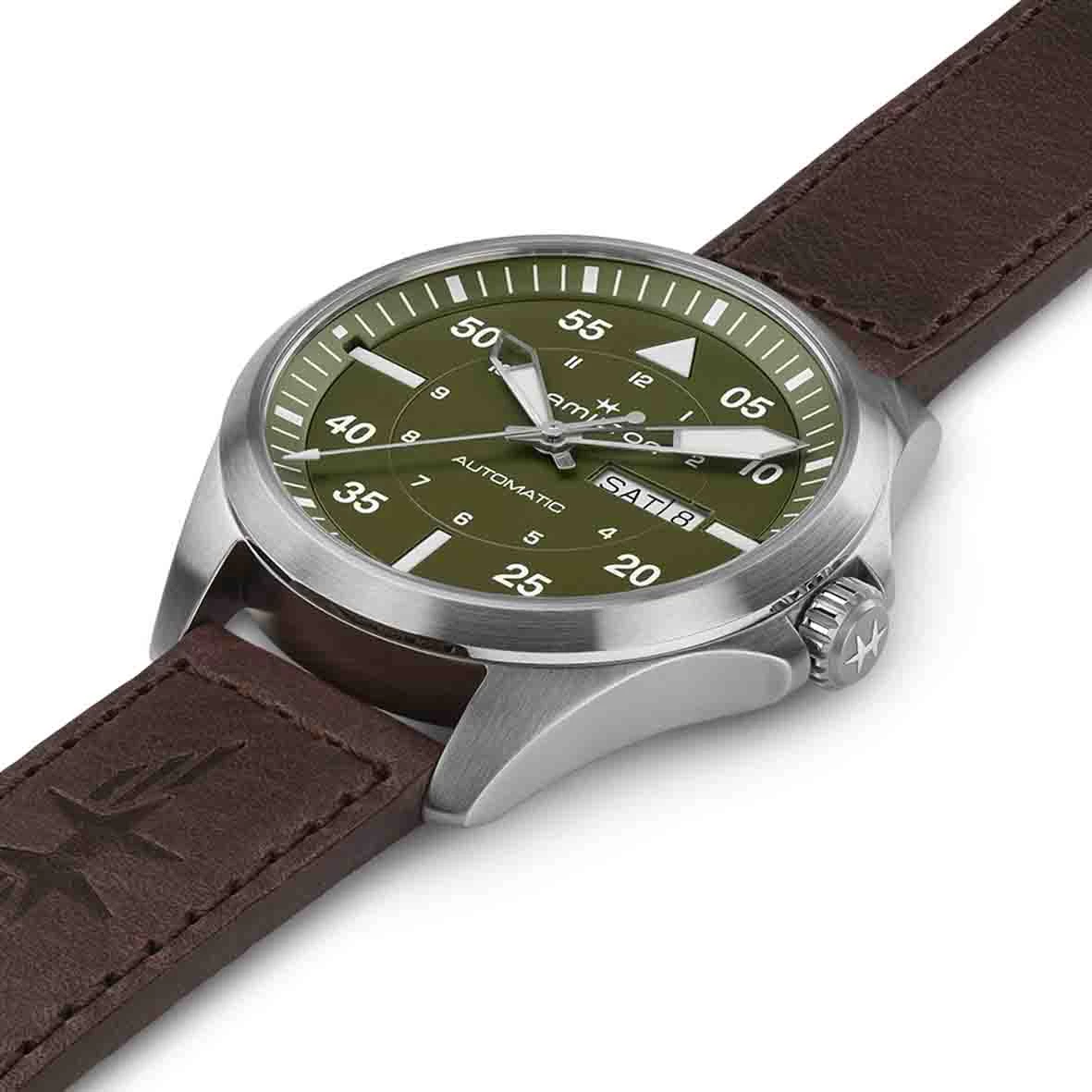 La Khaki Aviation Day Date 42 mm associe un bracelet en cuir marron foncé à un cadran vert olive, hommage aux racines de la Khaki, une montre d’aventure en plein air.
