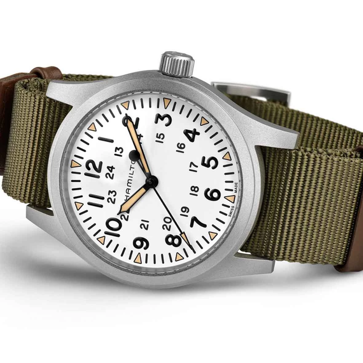 L’un des modèles les plus emblématiques d’Hamilton est désormais disponible dans un grand boîtier. Dotée de notre mouvement H-50 à remontage manuel exclusif, la Khaki Field Mechanical 42 mm reste fidèle à elle-même avec un boîtier en acier inoxydable sablé et un cadran blanc ou noir à la lisibilité accrue. Portée sur un bracelet en acier inoxydable ou avec une NATO en tissu vert, cette nouvelle version vous permettra de conjuguer style et aventure.