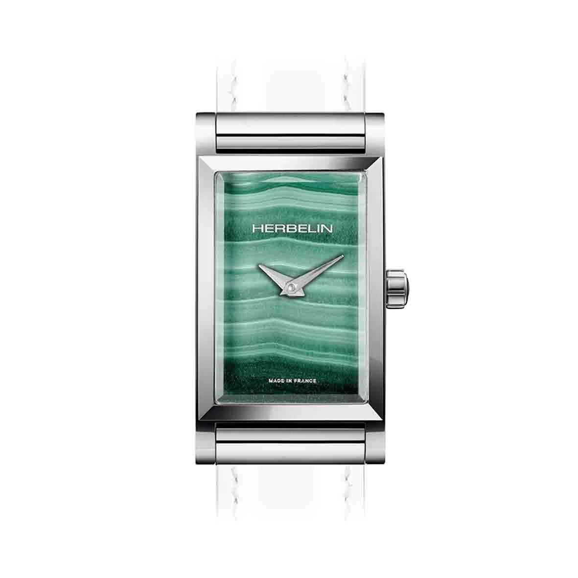 La montre rectangulaire a un boîtier large de 19 mm et haut de 27 mm en acier inoxydable.