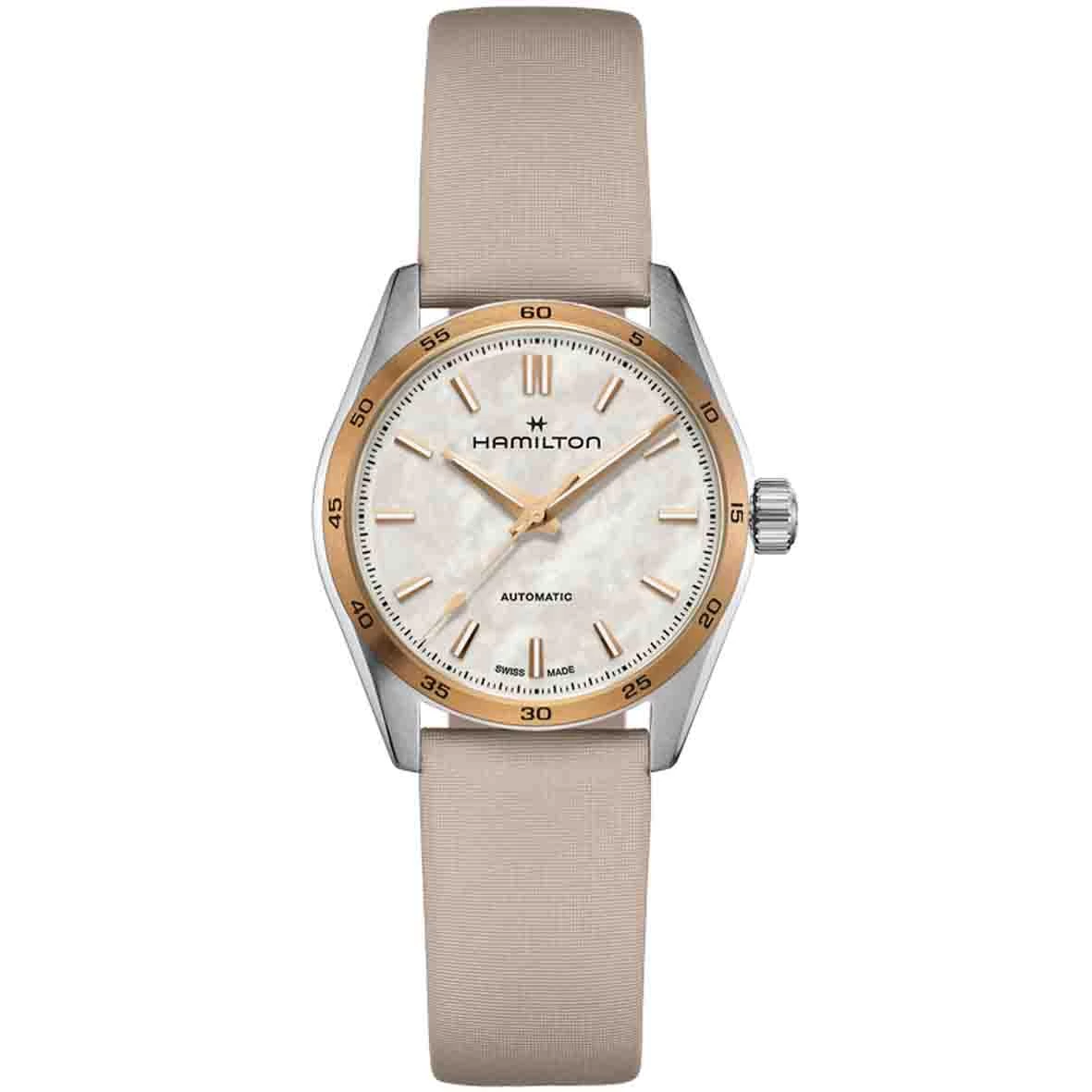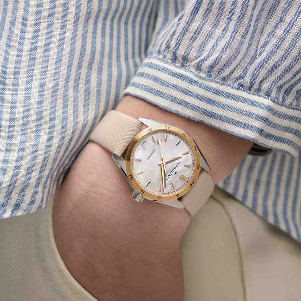 Conçues pour les amateurs de fonctionnalité et de style, les montres Jazzmaster Performer offrent une allure sport chic affirmée. Animée par le mouvement automatique H-10 avec une réserve de marche de 80 heures, cette Jazzmaster Performer Automatic présente un boîtier de 34 mm en acier inoxydable et une lunette avec revêtement PVD or rose rehaussée d’un cadran en nacre iridescente et d’un bracelet en satin beige.