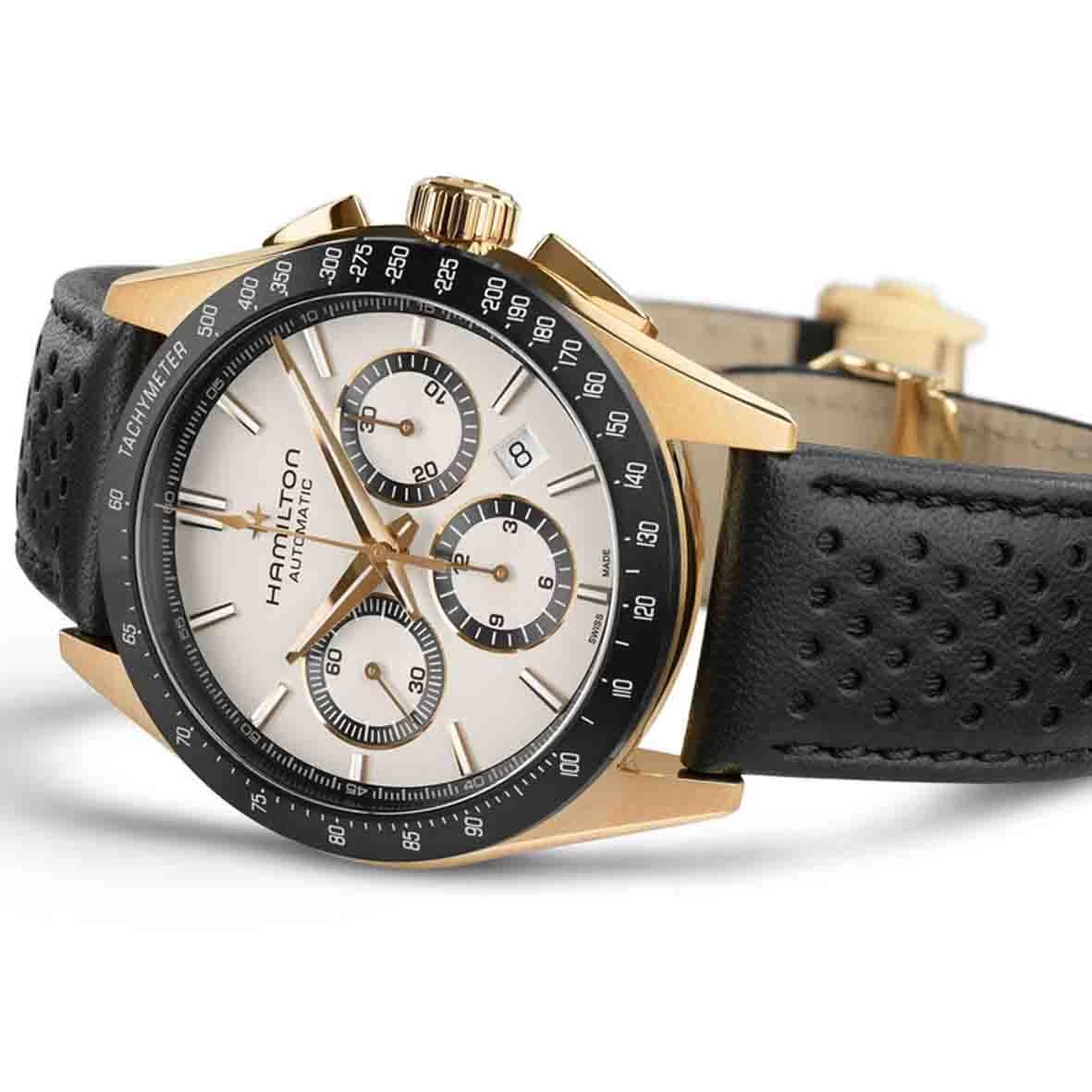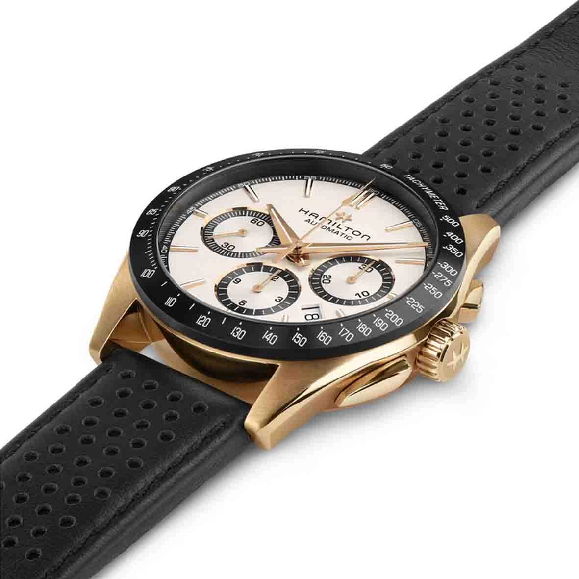 Conçues pour les amateurs de fonctionnalité et de style, les montres Jazzmaster Performer offrent une allure sport chic affirmée. Animée par le mouvement chronographe automatique H-31 avec une réserve de marche de 60 heures, cette Jazzmaster Performer Automatic Chronograph présente un boîtier de 42 mm en acier inoxydable avec revêtement PVD or rose, rehaussé d’un cadran blanc sobre et d’un bracelet en cuir noir perforé style sport assorti à la lunette.