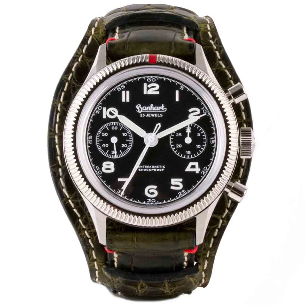 Au premier coup d’œil, les caractéristiques distinctives d’un chronographe Hanhart classique sont immédiatement apparentes : la disposition asymétrique des boutons, le bouton de remise à zéro rouge et, selon le modèle, la lunette tournante cannelée et le bracelet en cuir intemporel avec rivetage satiné.