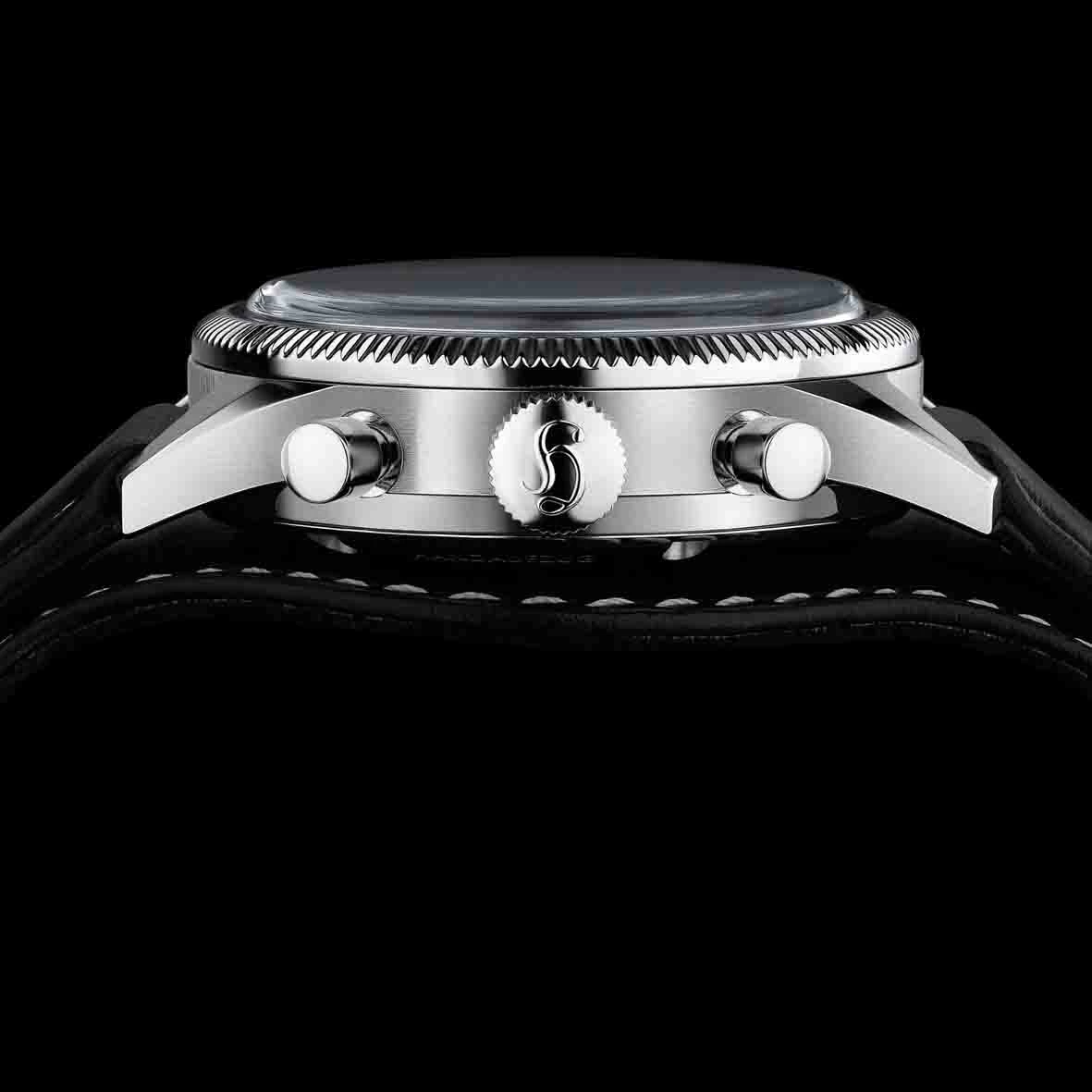 Avec le nouveau Hanhart 417 ES, nous célébrons le retour de ce chronographe légendaire. ES signifie le mot allemand « Edelstahl » qui est la traduction de l’acier inoxydable. Vous ne pourrez peut-être pas voyager dans le temps avec, mais nous avons combiné les détails les plus passionnants du passé avec les matériaux les plus modernes de notre époque. Son boîtier en acier inoxydable mesure désormais un diamètre contemporain de 42 mm, au lieu des 39 mm d’origine. Malgré le verre saphir fortement bombé, l’épaisseur du boîtier ne dépasse pas 13,3 mm. Notre objectif était de concevoir la 417 ES la plus fine possible afin qu’elle soit présente au poignet mais pas surproportionnée.