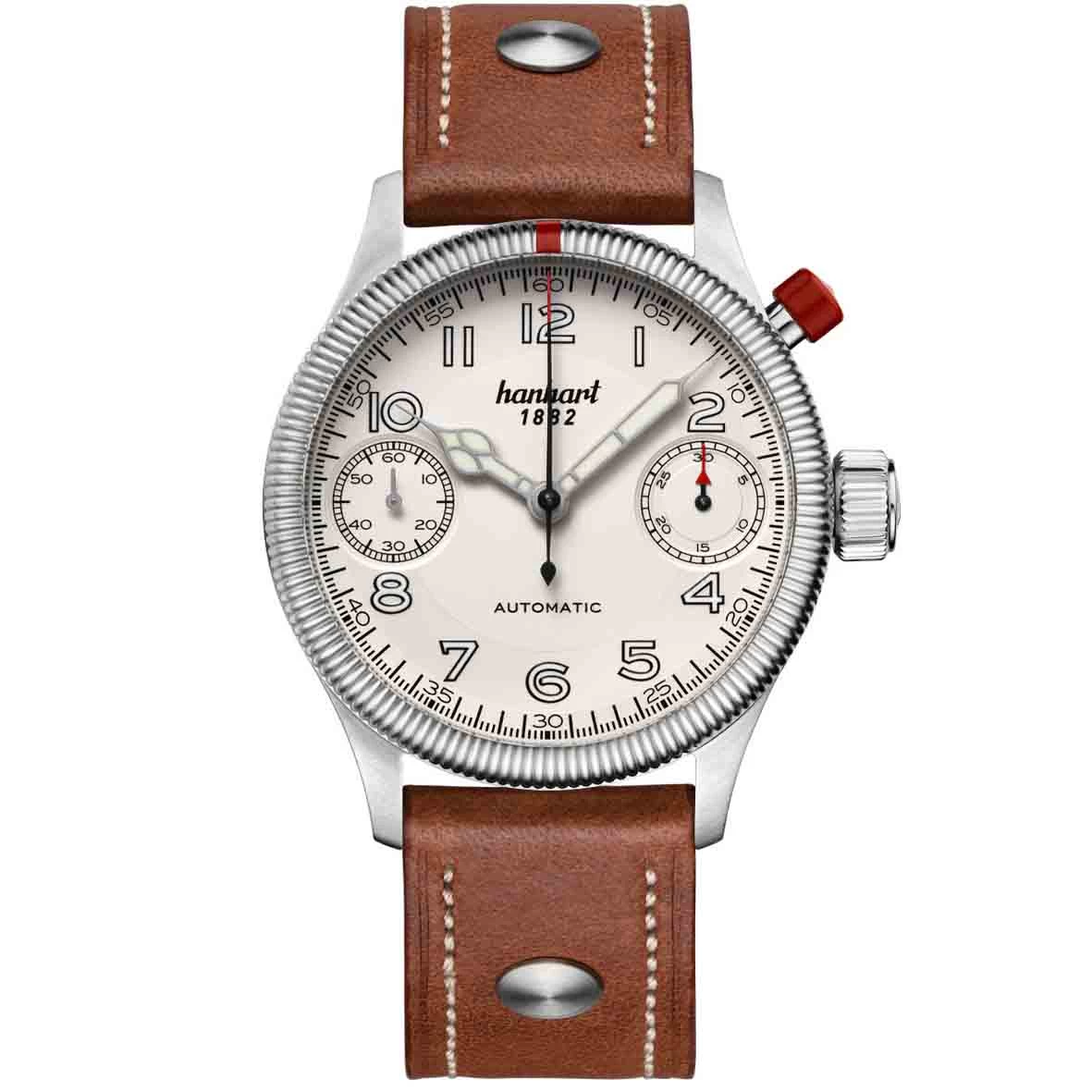 Au premier coup d’œil, les caractéristiques distinctives d’un chronographe Hanhart classique sont immédiatement apparentes : la disposition asymétrique des boutons, le bouton de remise à zéro rouge et, selon le modèle, la lunette tournante cannelée et le bracelet en cuir intemporel avec rivetage satiné.