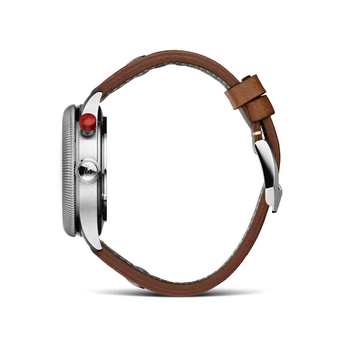 Tout comme ses prédécesseurs légendaires produits par Hanhart, le PIONEER MonoScope dispose d’un seul bouton pour contrôler l’ensemble des fonctions du chronographe.