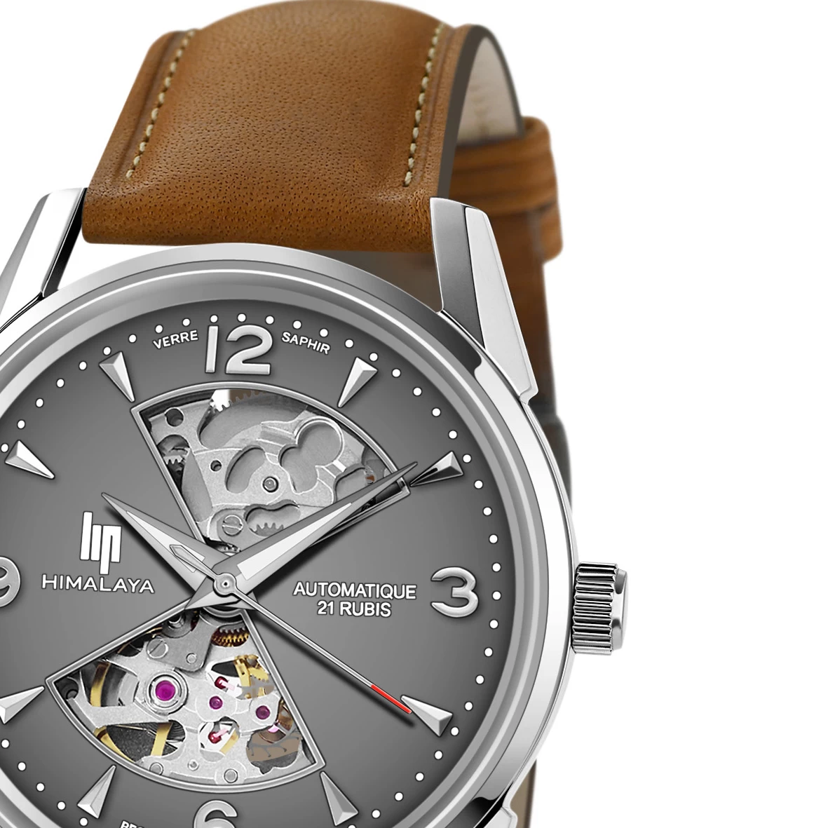Le cadran de couleur gris est doté d’index triangulaires en relief avec des aiguilles heure, minute et seconde argentés.