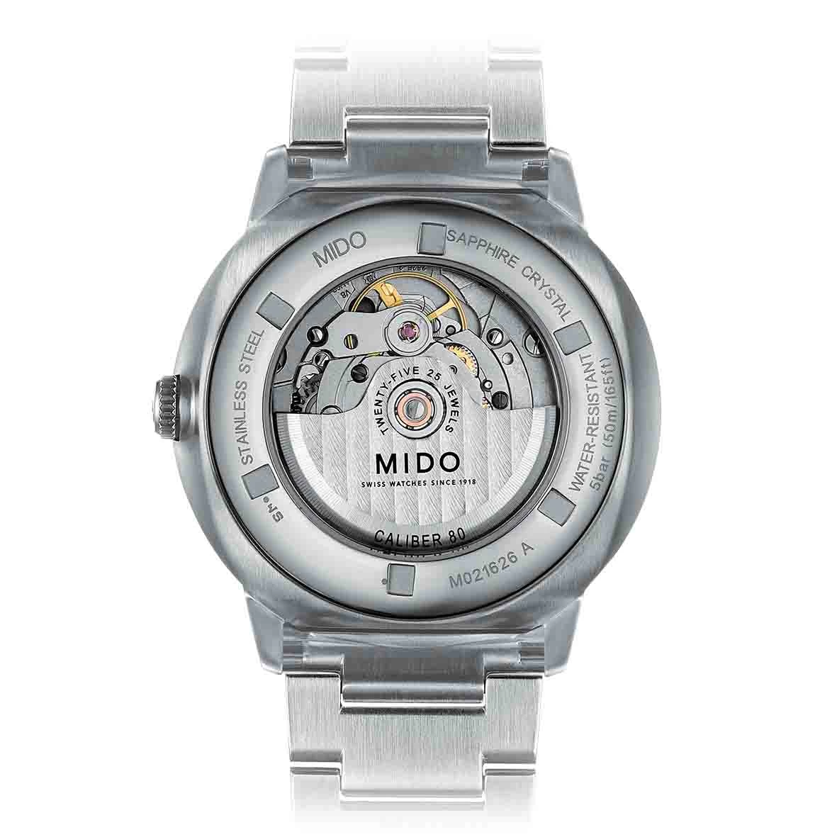 Finement décoré avec une masse oscillante ornée de côtes de Genève et du logo MIDO, le mouvement peut être observé à travers le fond de boîte en glace saphir de la Commander Big Date et de la Baroncelli Big Date.