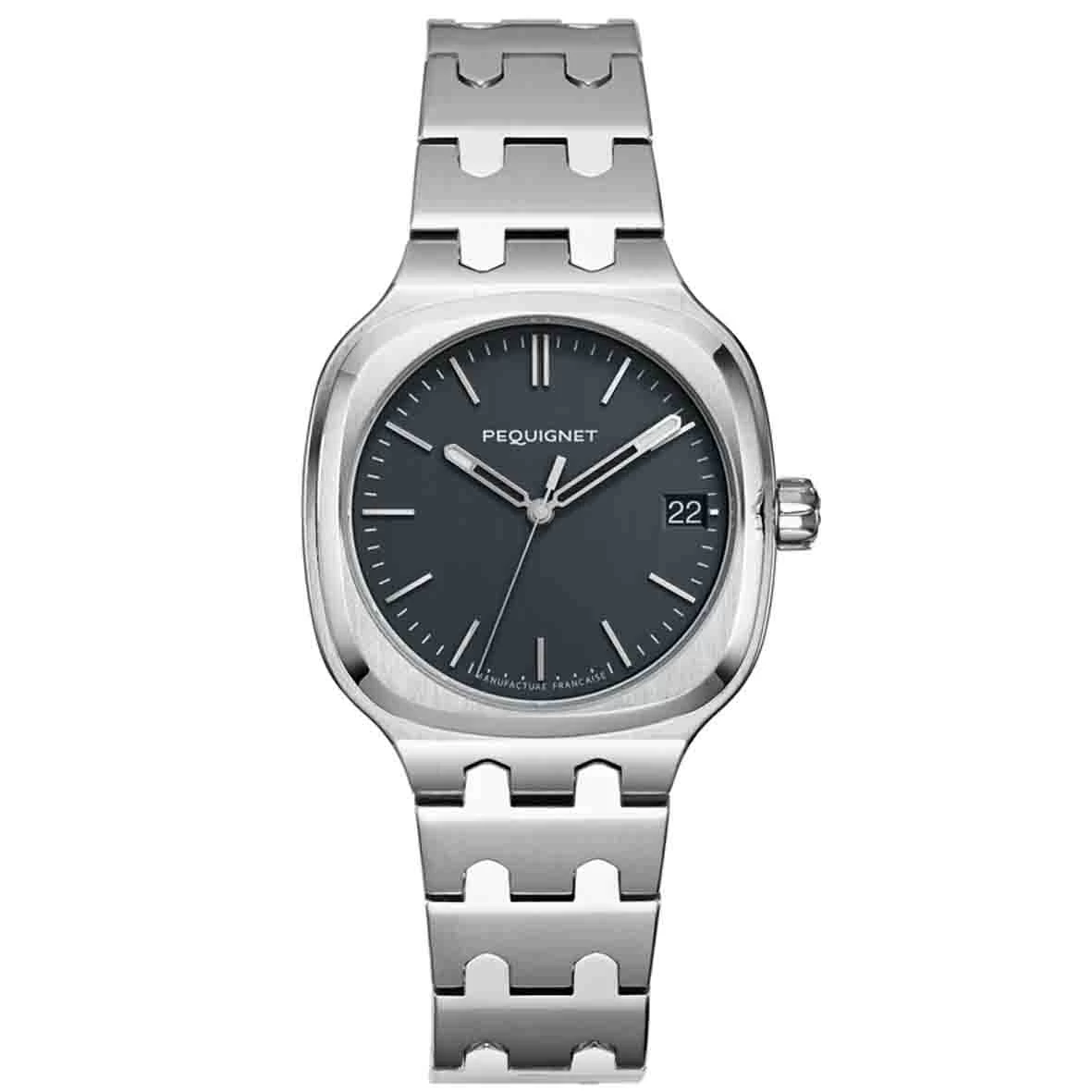 ParĂ©e d’un cadran Gris Anthracite, la Concorde est Ă©galement dotĂ©e d’une maille signature, dĂ©veloppĂ©e en exclusivitĂ© par la Manufacture Jurassienne.