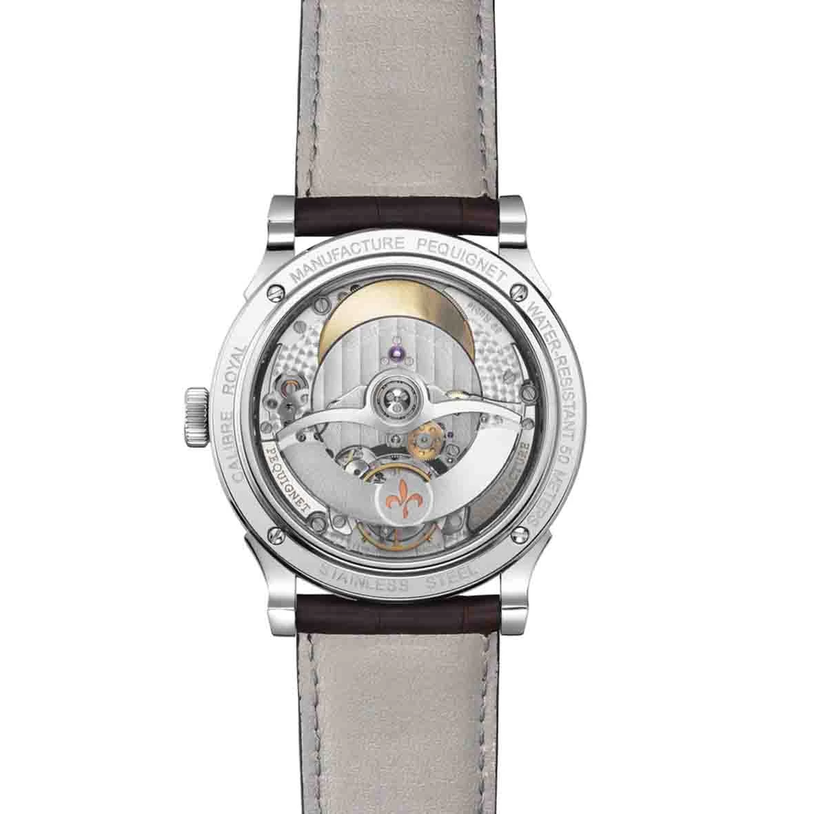 La collection Royale est animĂ©e par le Calibre Royal, conçu, prototypĂ©, contrĂ´lĂ© et assemblĂ© dans les laboratoires Pequignet Haute Horlogerie Ă Morteau.Â