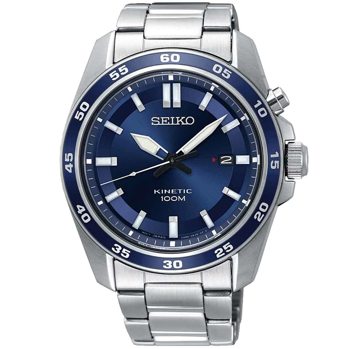 Un guichet date est positionné à 3h, avec l’indication Kinetic 100 m à 6h et le logo de la marque Seiko à 12h.